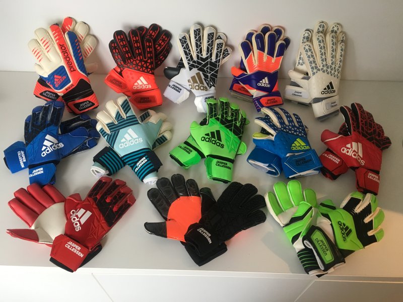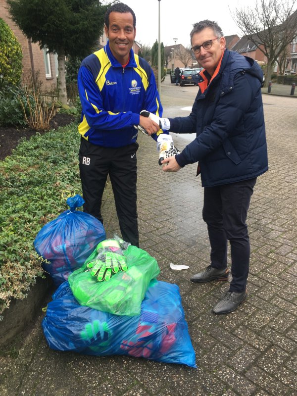 Vader Ton overhandigt namens Jasper maar liefst ruim 100 paar keeperhandschoen met de naam van Jasper Cillessen op de handschoenen bedrukt.